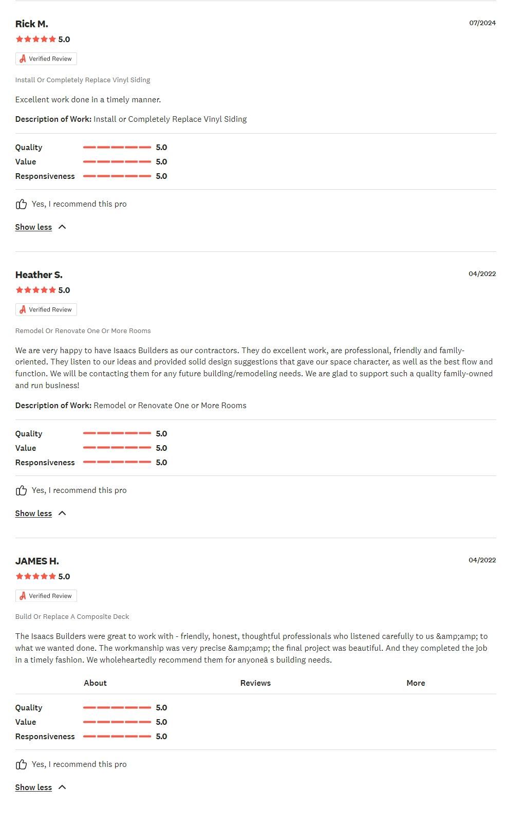 We locally source materials, employ trusted carpenters, and uphold the Isaacs family standards. Being held to a higher standard will result in quality work.